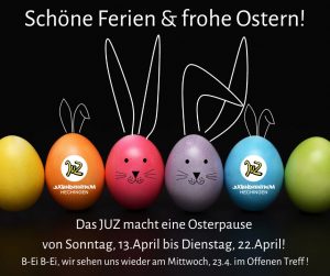 Das JUZ macht eine Osterpause von Sonntag, 13.04. bis einschließlich Montag, 21.04. und wünscht allen frohe Osterfeiertage.