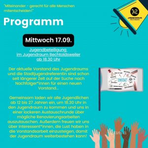 Der jetzige Vorstand und die Stadtjugendreferentin sind schon seit längerer Zeit auf der Suche nach Nachfolger*innen für einen neuen Vorstand. Gemeinsam laden wir alle Jugendlichen ab 12 bis 27 Jahren ein, um 18.30 Uhr in den Jugendraum zu kommen und uns in einer lockeren Austauschrunde über mögliche Renovierungsarbeiten auszutauschen. Außerdem freuen wir uns über Interessent*innen, die in die Vorstandsarbeit einsteigen wollen.