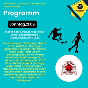 Der Skateverein reiht sich in die Vielzahl der Hechinger Sportvereine ein und bietet für junge Interessierte einen „Skate-Parcours“ am Familiensporttag der Stadt Hechingen an. Unter dem Motto “Hechingen bewegt sich”, wird auf dem Skatepark natürlich geskatet (allerdings NICHT bei Regenwetter). Nicht nur das Thema Jugendbeteiligung in den verschiedensten Sport-Vereinen der Stadt Hechingen steht an dem Tag im Mittelpunkt.