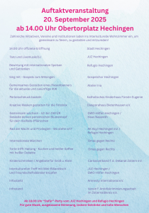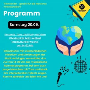Gemeinsam mit unterschiedlichen Initiativen und Einrichtung der Stadt Hechingen veranstaltet das JUZ ab 14 Uhr bis 22 Uhr das musikalische Rahmenprogramm, bei dem auch junge Menschen mit Tanz und Musik ihre interkulturellen Talente zeigen. Kommt zahlreich und feiert mit uns.